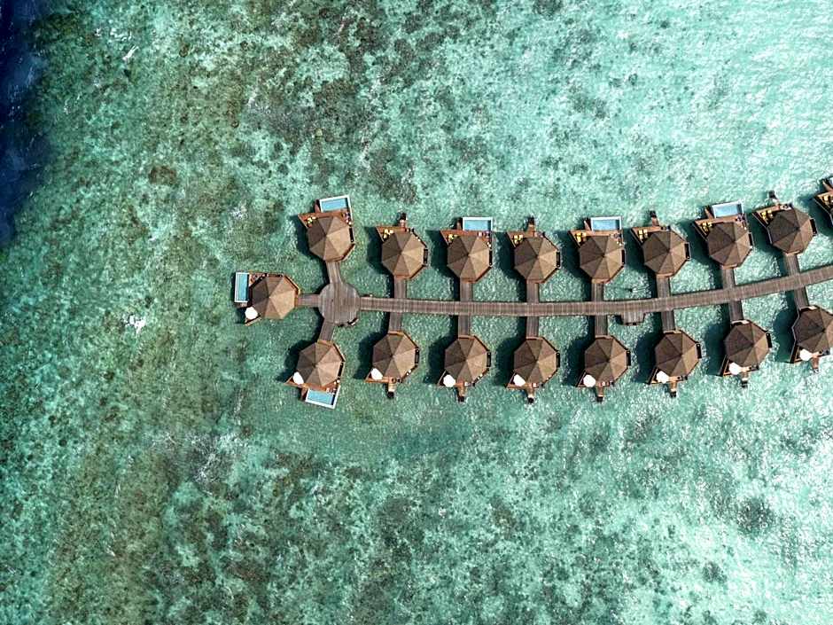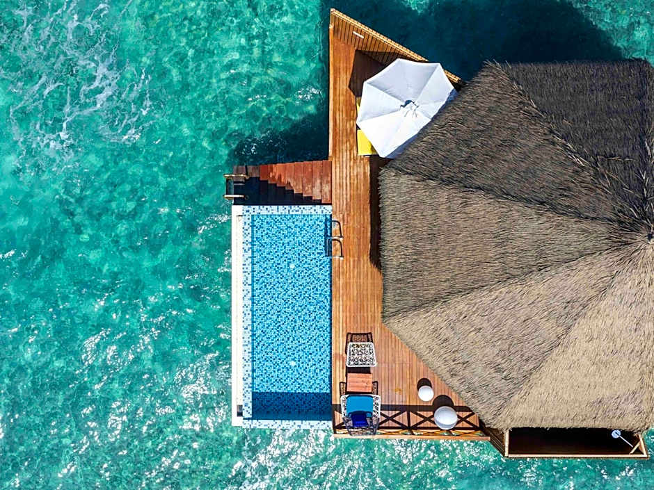 Over Water Reef Pool Villa is 872 square feet and includes a king-size bed 150-183 width and is Wheelchair-accessible.