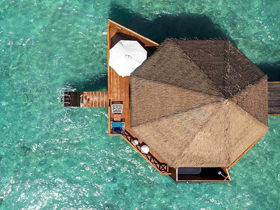 Over Water Reef Pool Villa is 872 square feet and includes a king-size bed 150-183 width and is Wheelchair-accessible.