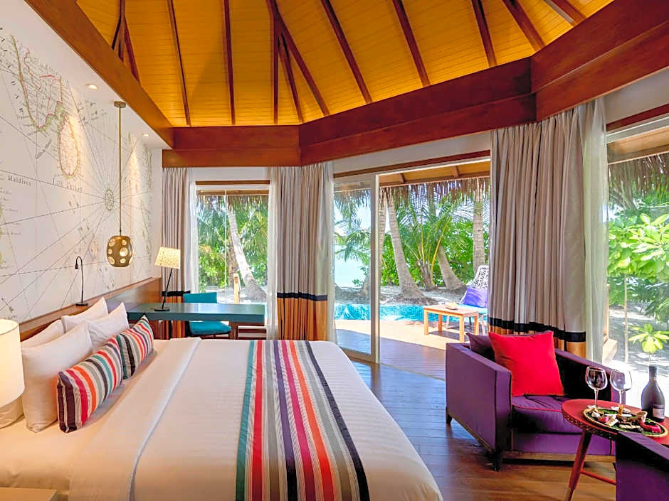 Over Water Reef Pool Villa is 872 square feet and includes a king-size bed 150-183 width and is Wheelchair-accessible.