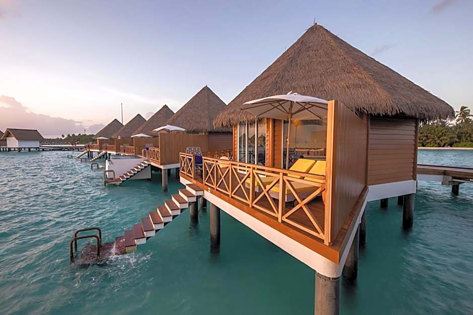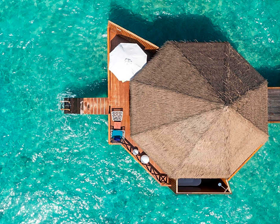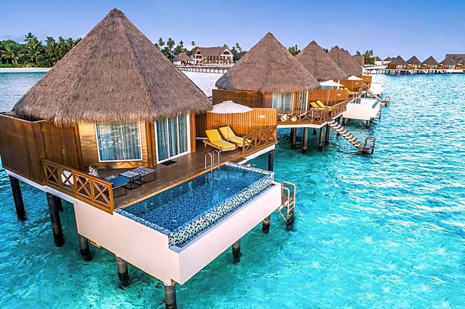 Over Water Reef Pool Villa is 872 square feet and includes a king-size bed 150-183 width and is Wheelchair-accessible.